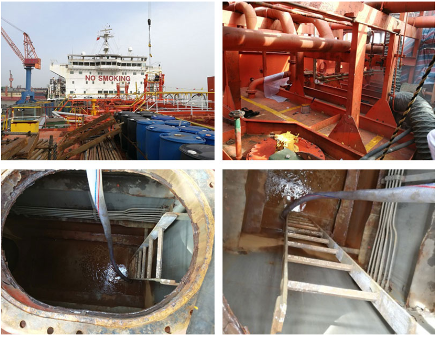 某外轮化学品船干隔舱锈蚀,有大约70m³化学品遗留干隔舱。为对干隔舱补焊,必须先清除遗留化学品。受船东委托,我司安排专业清洗队伍,在做好防火、防暴、防毒等安全工作前提下,圆满完成清舱作业。